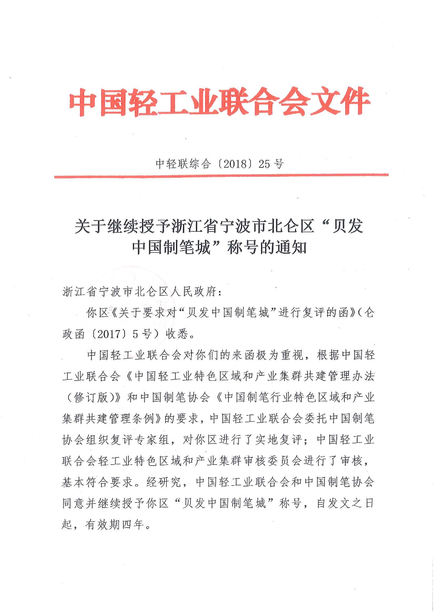 关于继续授予浙江省宁波市北仑区“贝发 中国制笔城”称号的通知