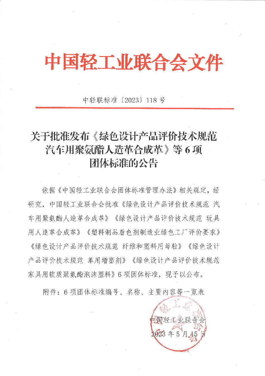 "糖心视频观看" 关于批准发布《绿色设计产品评价技术规范 汽车用聚氨酯人造革合成革》等6项团体标准的公告