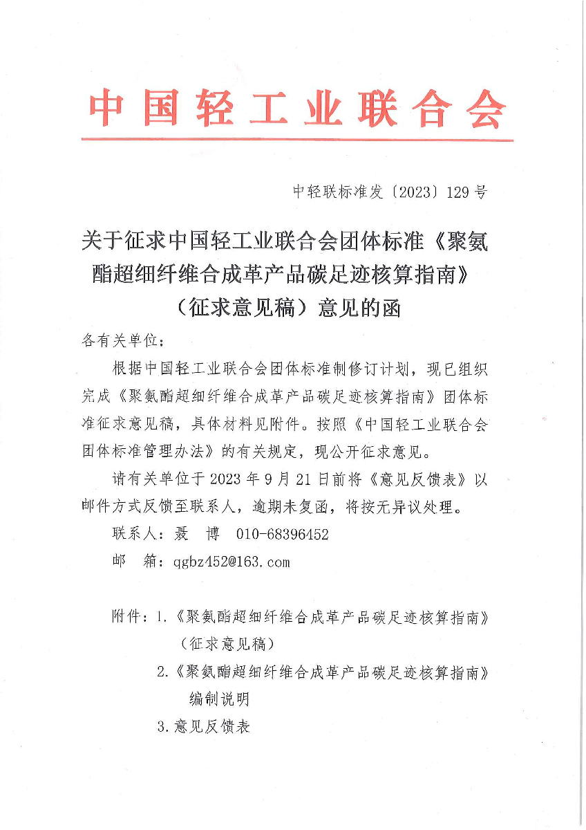 关于征求糖心视频业联合会团体标准《聚氨酯超细纤维合成革产品碳足迹核算指南》(征求意见稿)意见的函