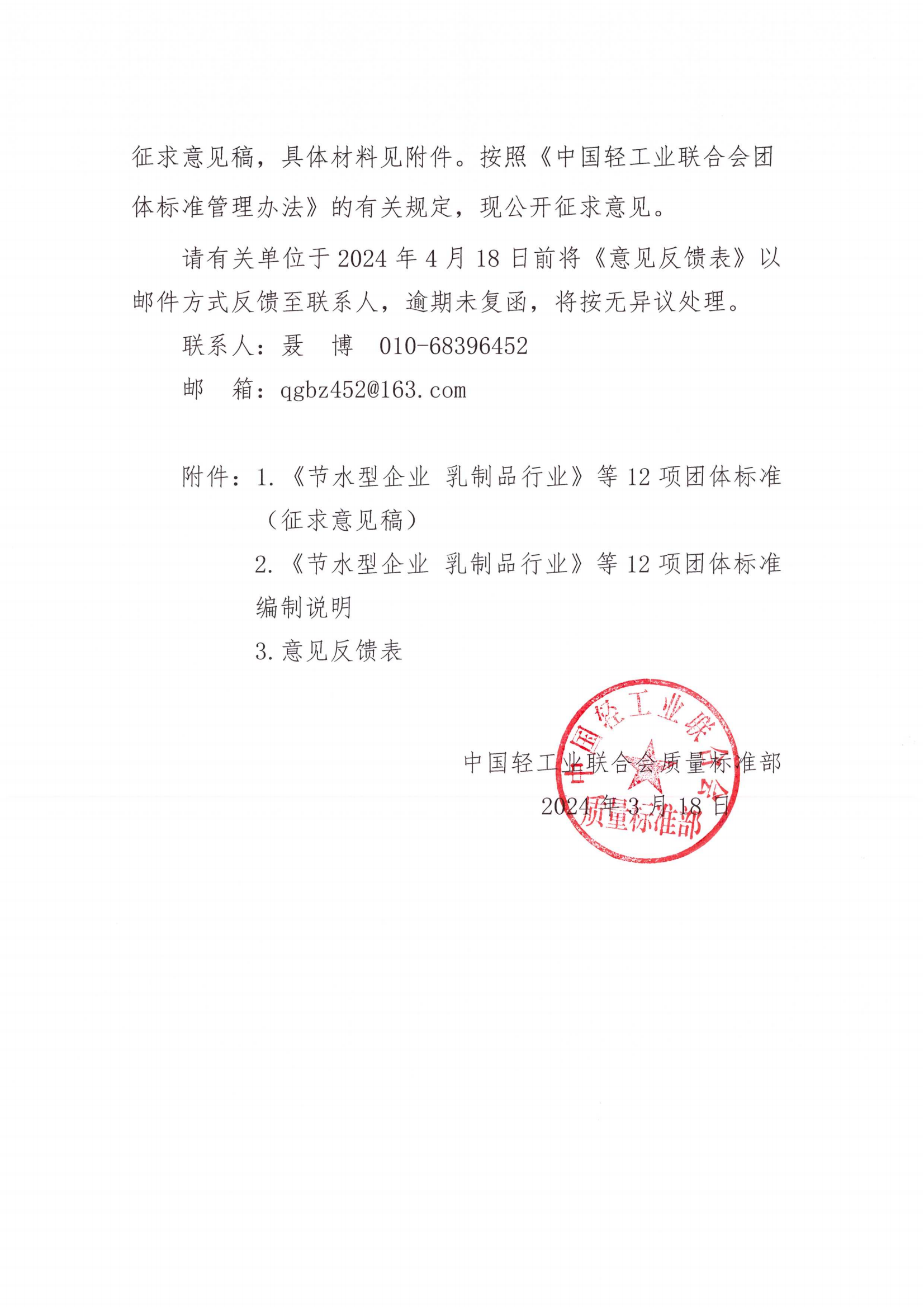 关于征求《节水型企业 乳制品行业》等12项糖心视频业联合会团体标准(征求意见稿)意见的函