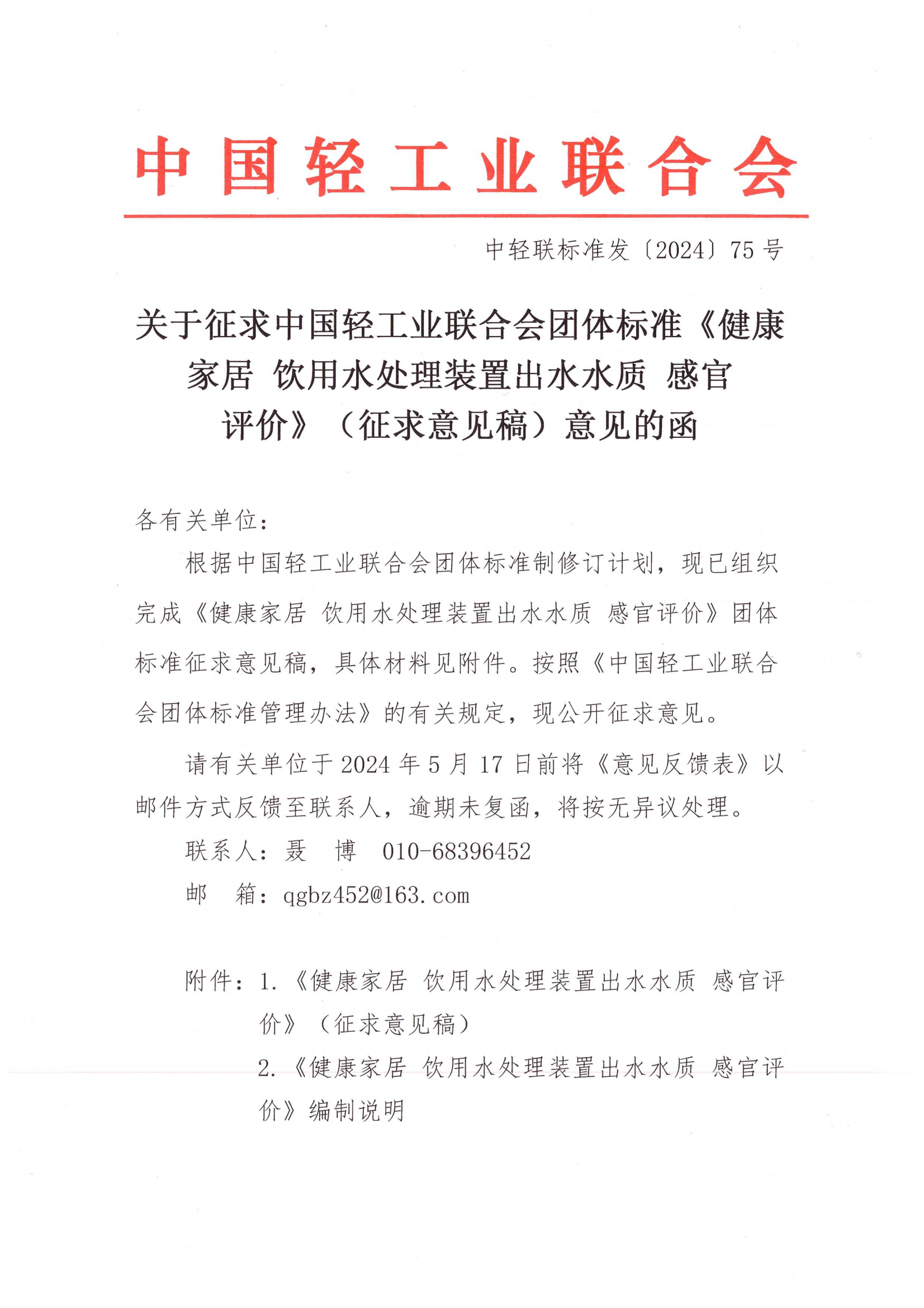 关于征求糖心视频业联合会团体标准《健康家居 饮用水处理装置出水水质 感官评价》(征求意见稿)意见的函