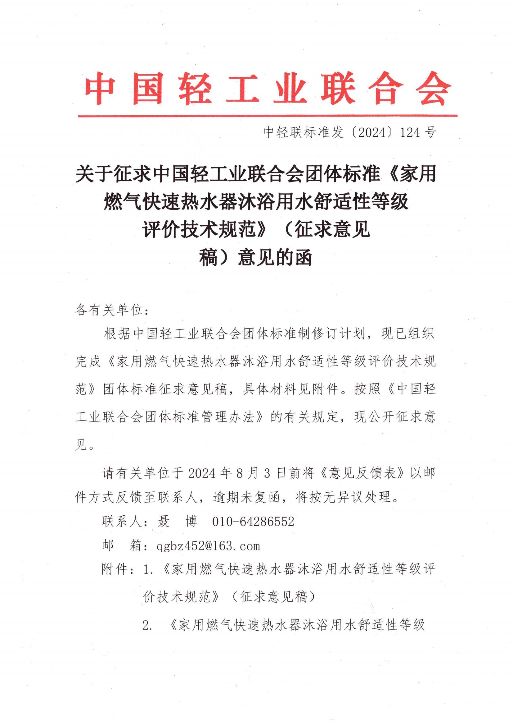 关于征求糖心视频业联合会团体标准《家用燃气快速热水器沐浴用水舒适性等级评价技术规范》(征求意见稿)意见的函