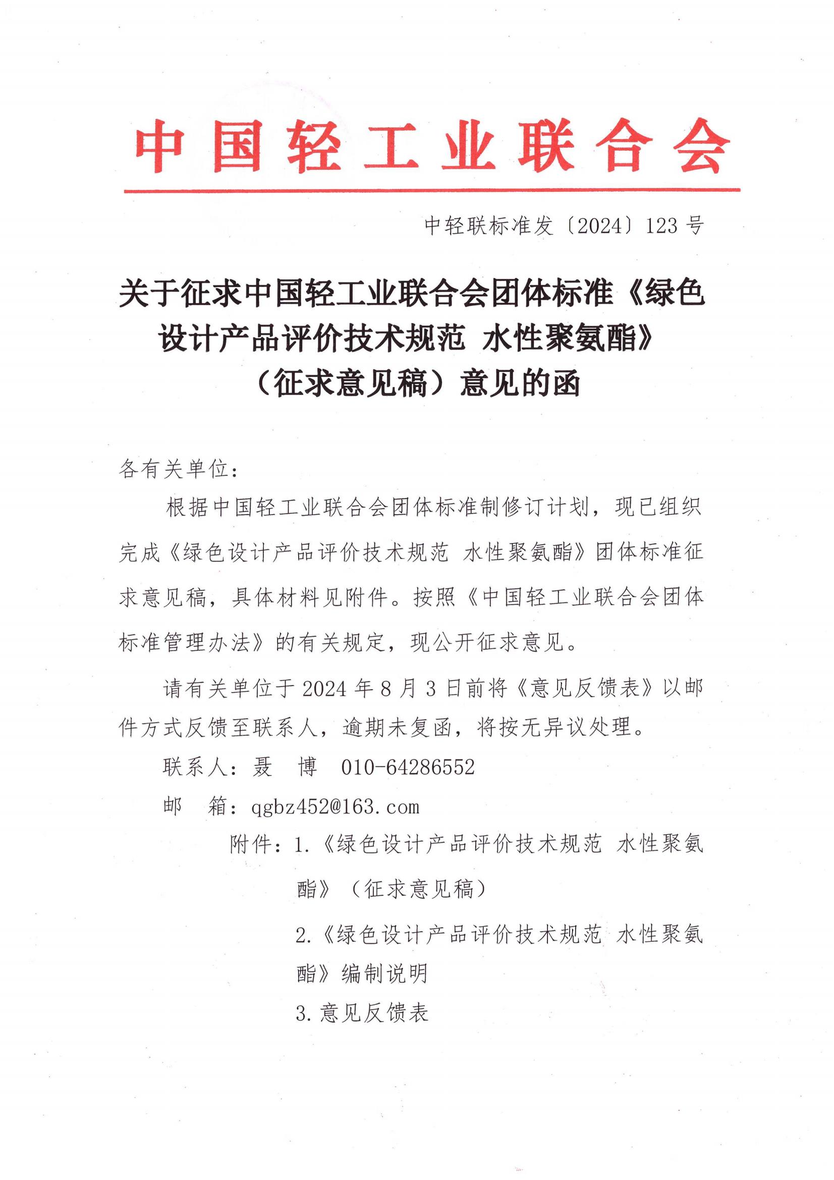 关于征求糖心视频业联合会团体标准《绿色设计产品评价技术规范 水性聚氨酯》(征求意见稿)意见的函