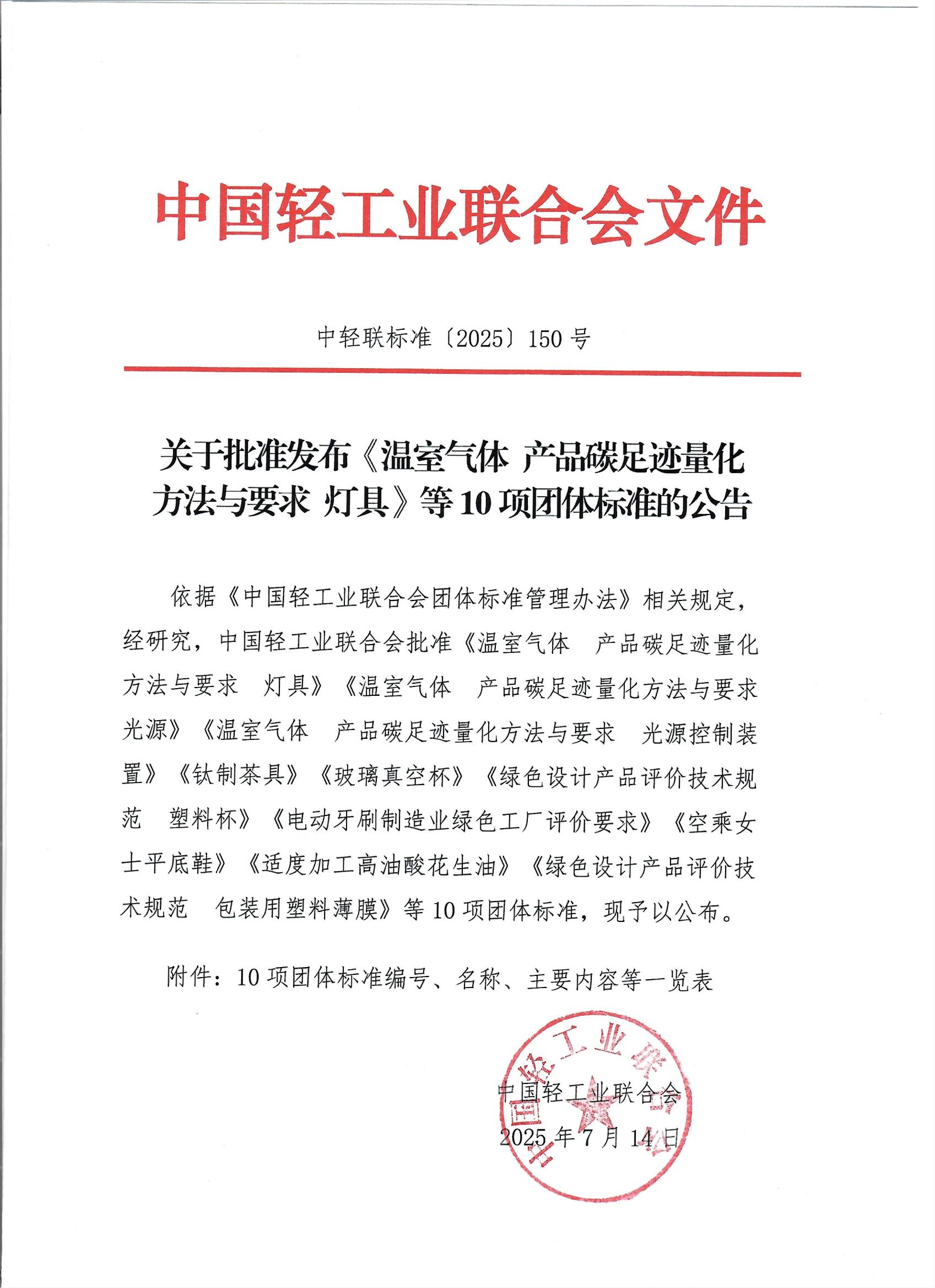 关于批准发布《温室气体产品碳足迹量化方法与要求灯具》等10项团体标准的公告