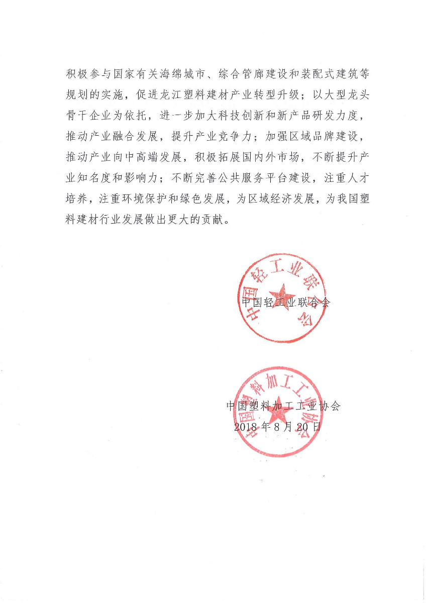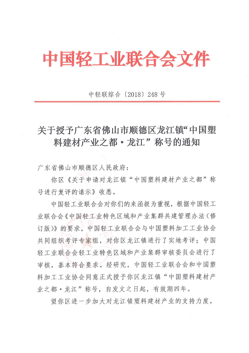 关于授予广东省佛山市顺德区龙江镇“中国塑料建材产业之都·龙江”称呼的通知