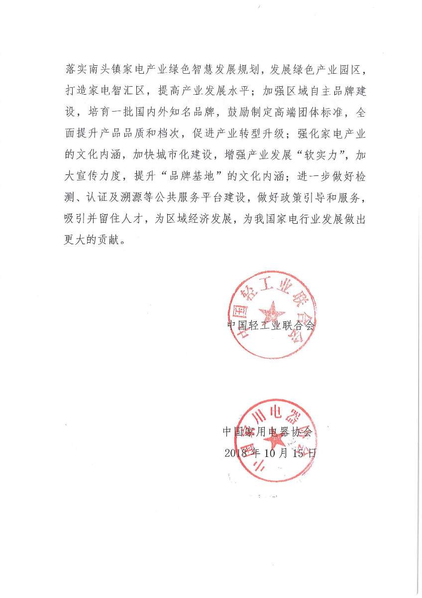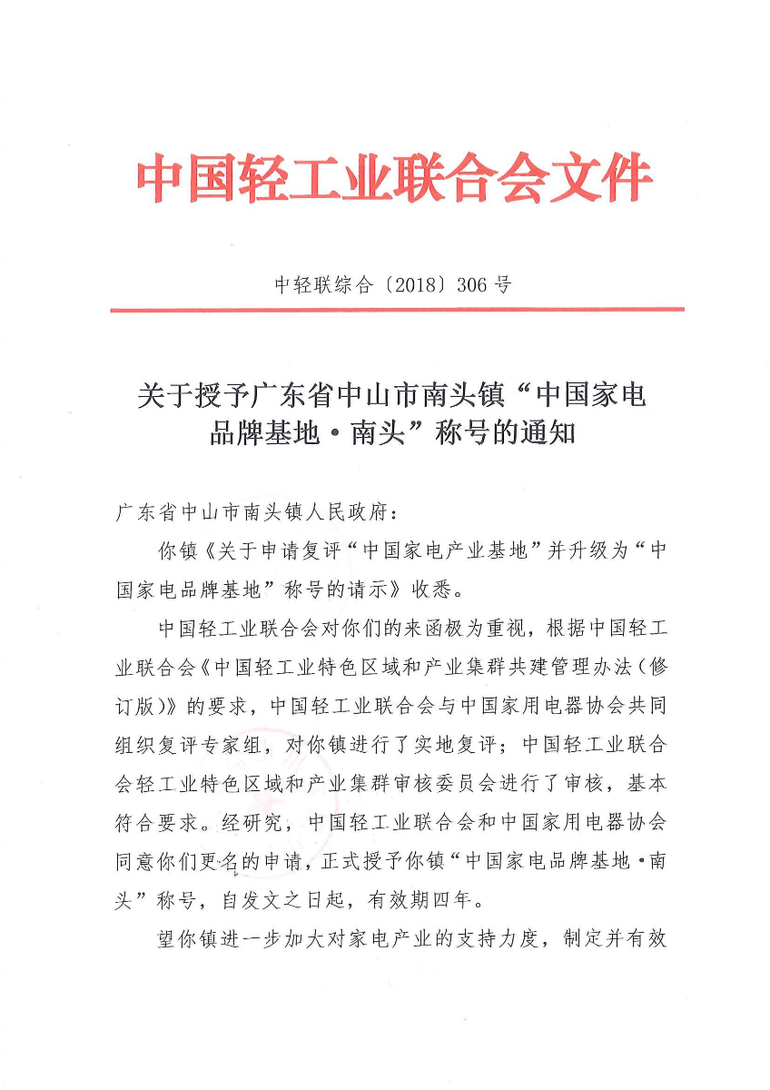 关于授予广东省中山市南头镇“中国家电品牌基地·南头”称号的通知