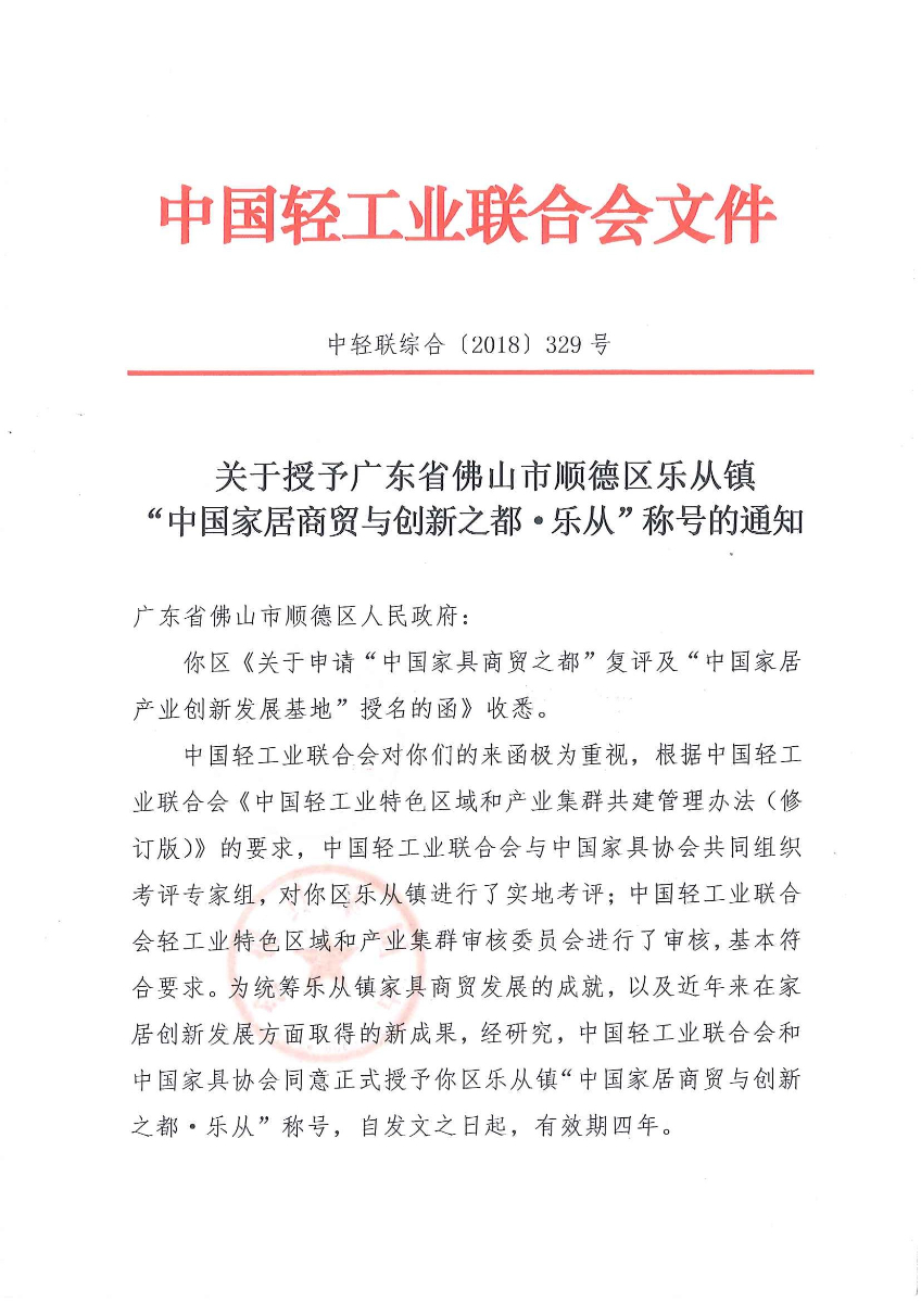 糖心视频高清 - 关于授予广东省佛山市顺德区乐从镇“中国家居商贸与创新之都·乐从”称号的通知