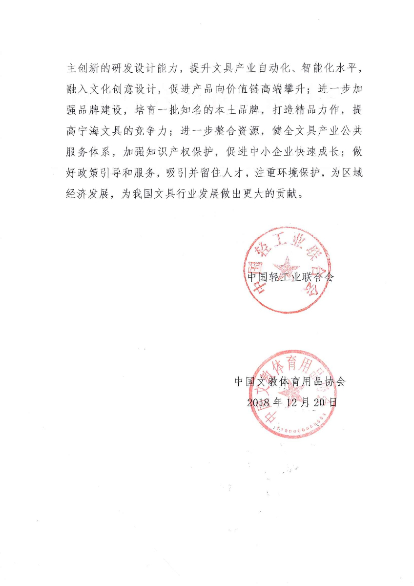 关于继续授予浙江省宁海县“中国文具产业基地·宁海”称号的通知
