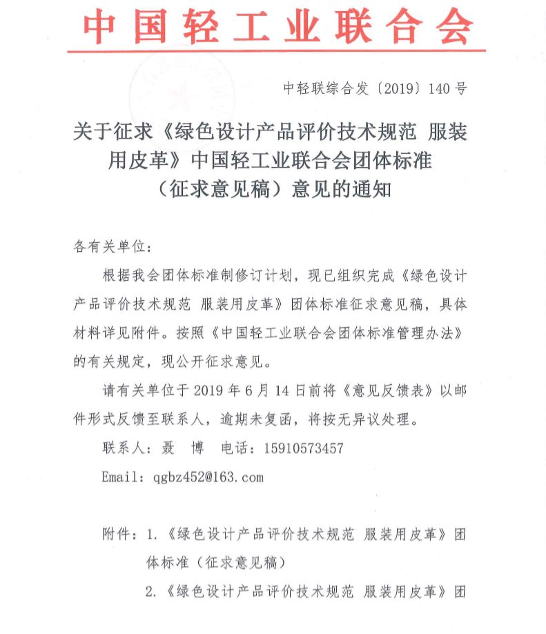 关于征求《绿色设计产品评价技术规范 服装用皮革》糖心视频业联合会团体标准(征求意见稿)意见的通知