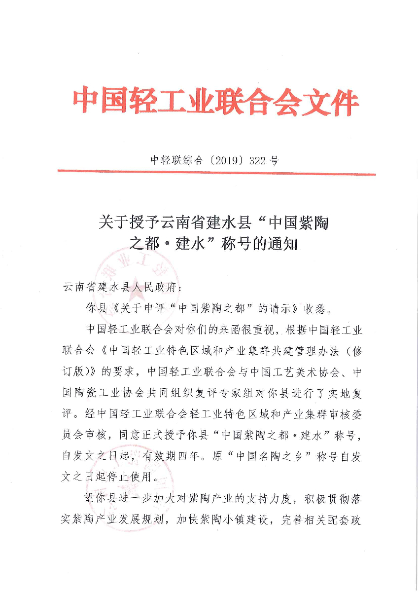 关于授予云南省建水县“中国紫陶之都·建水”称号的通知