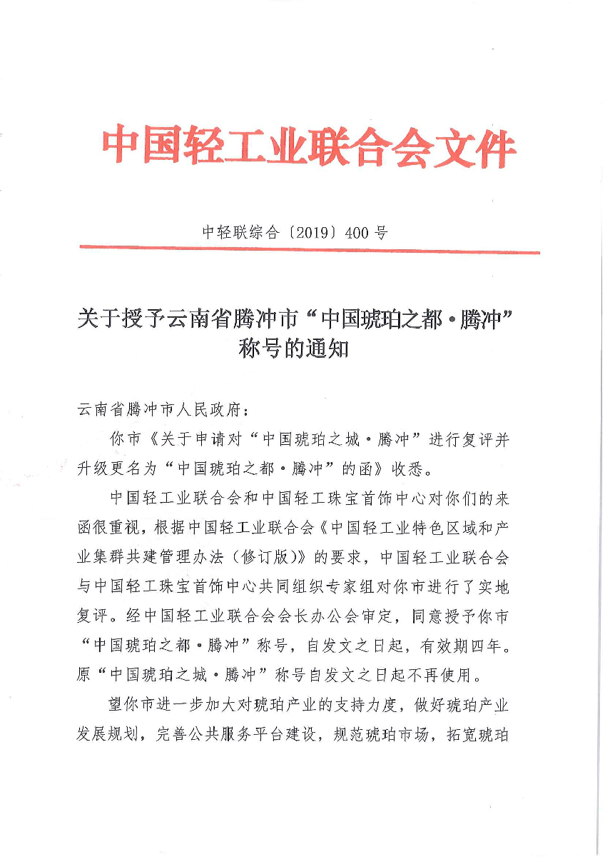 关于授予云南省腾冲市“中国琥珀之都·腾冲”称号的通知