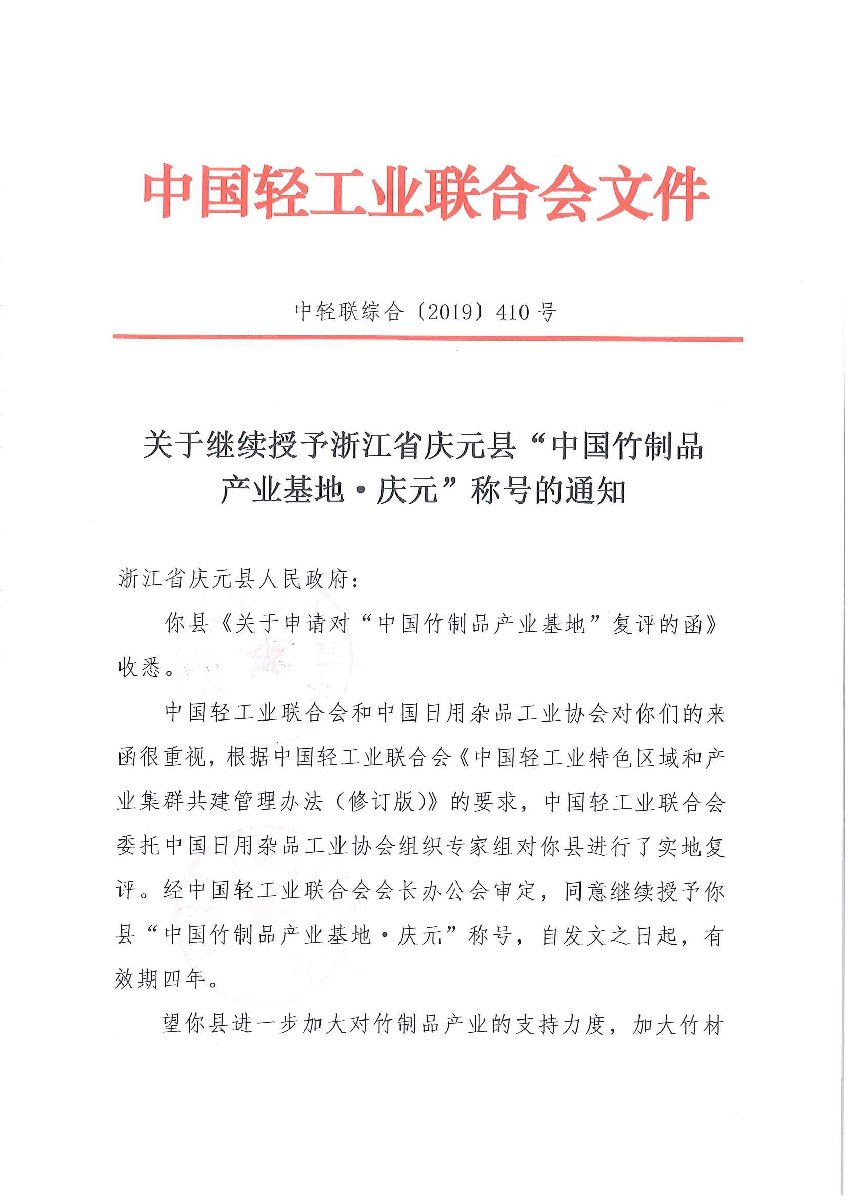 "糖心视频网站" 关于继续授予浙江省庆元县“中国竹制品产业基地·庆元”称号的通知