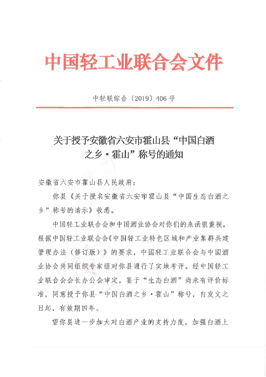 关于授予安徽省六安市霍山县“中国白酒之乡·霍山”称号的通知