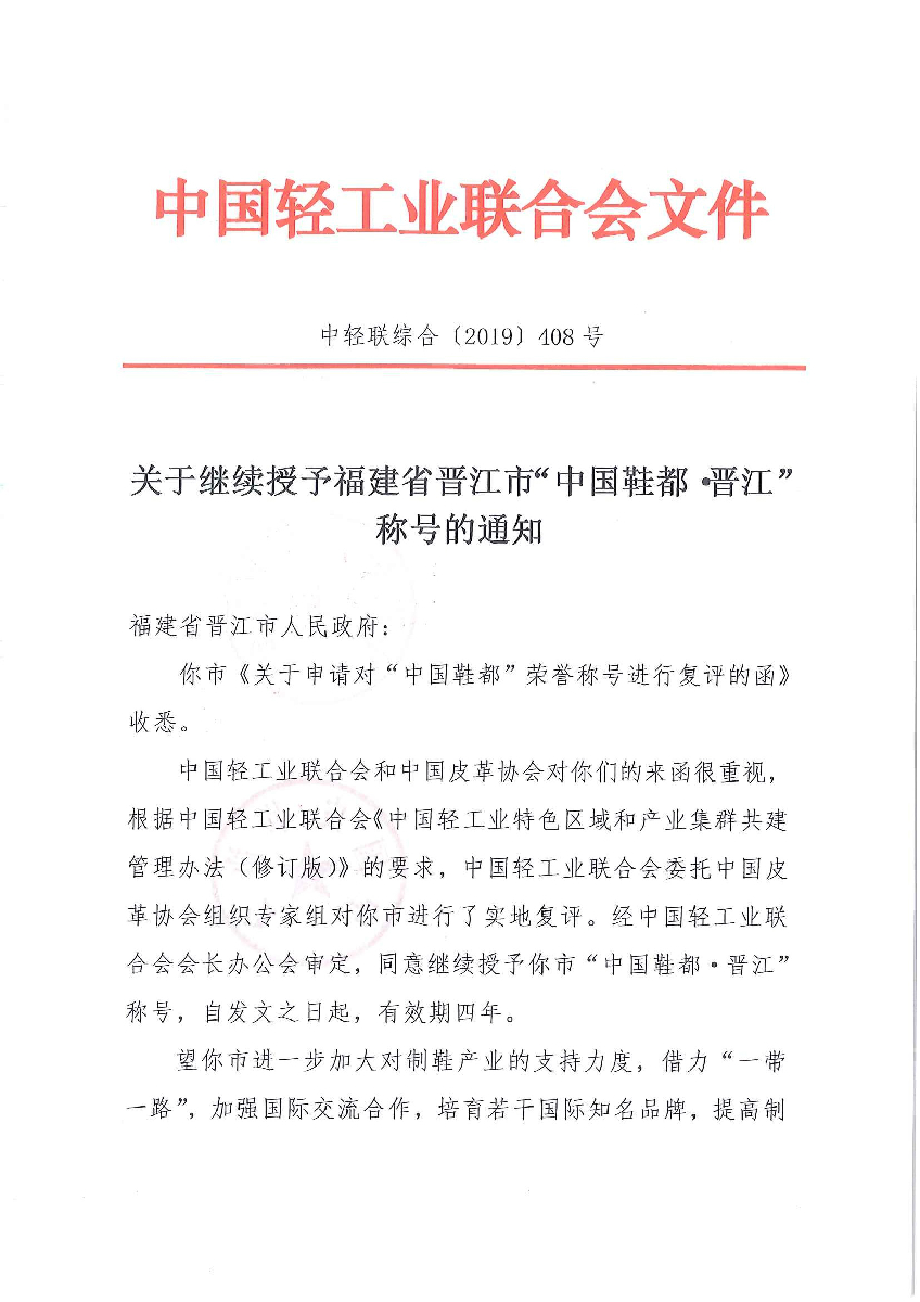 关于继续授予福建省晋江市“中国鞋都·晋江”称号的通知
