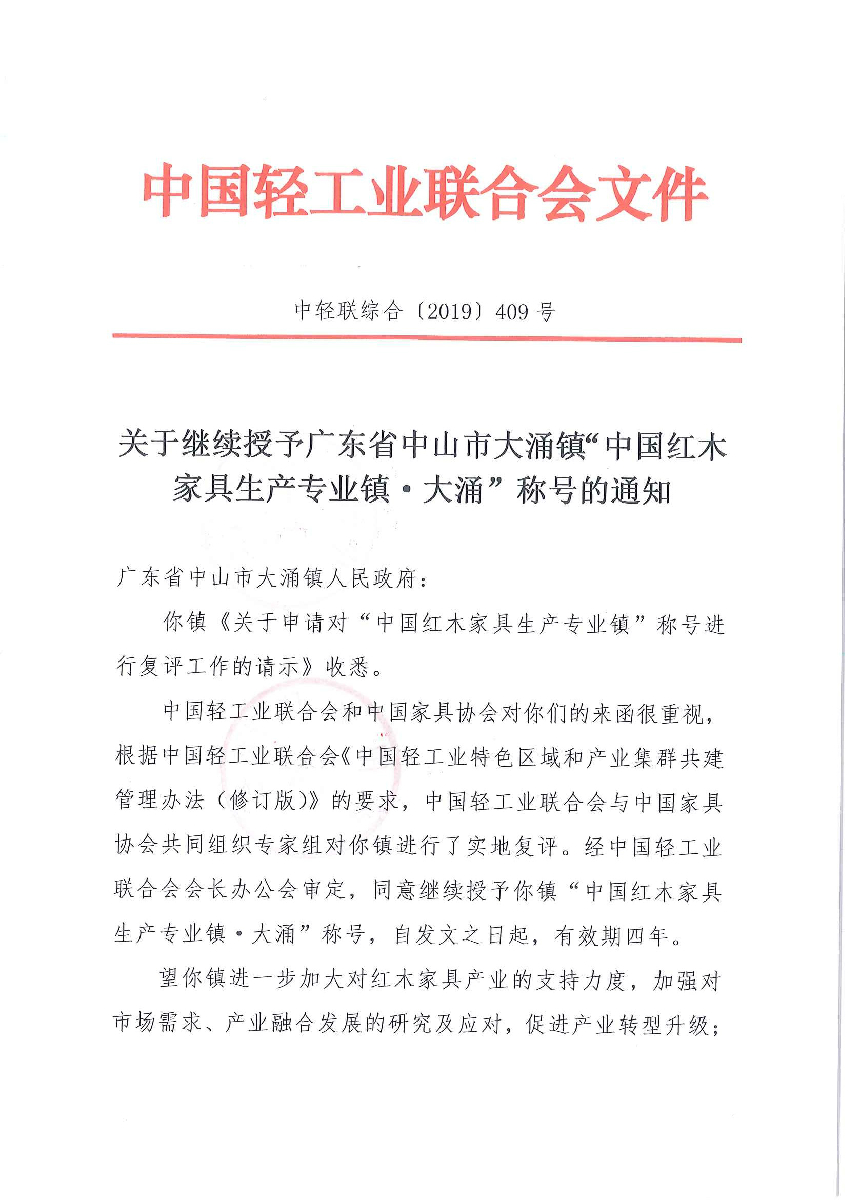 关于继续授予广东省中山市大涌镇“中国红木家具生产专业镇·大涌”称号的通知