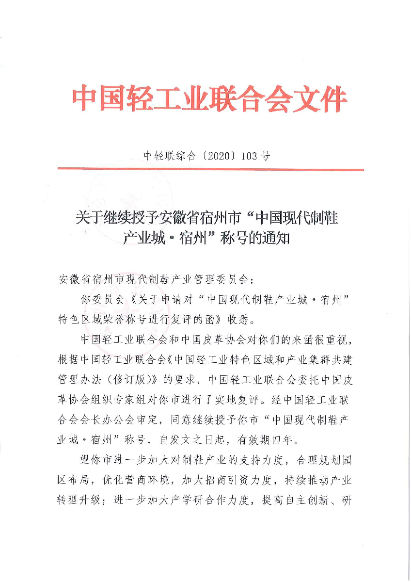 关于继续授予安徽省宿州市“中国现代制鞋产业城·宿州”称号的通知