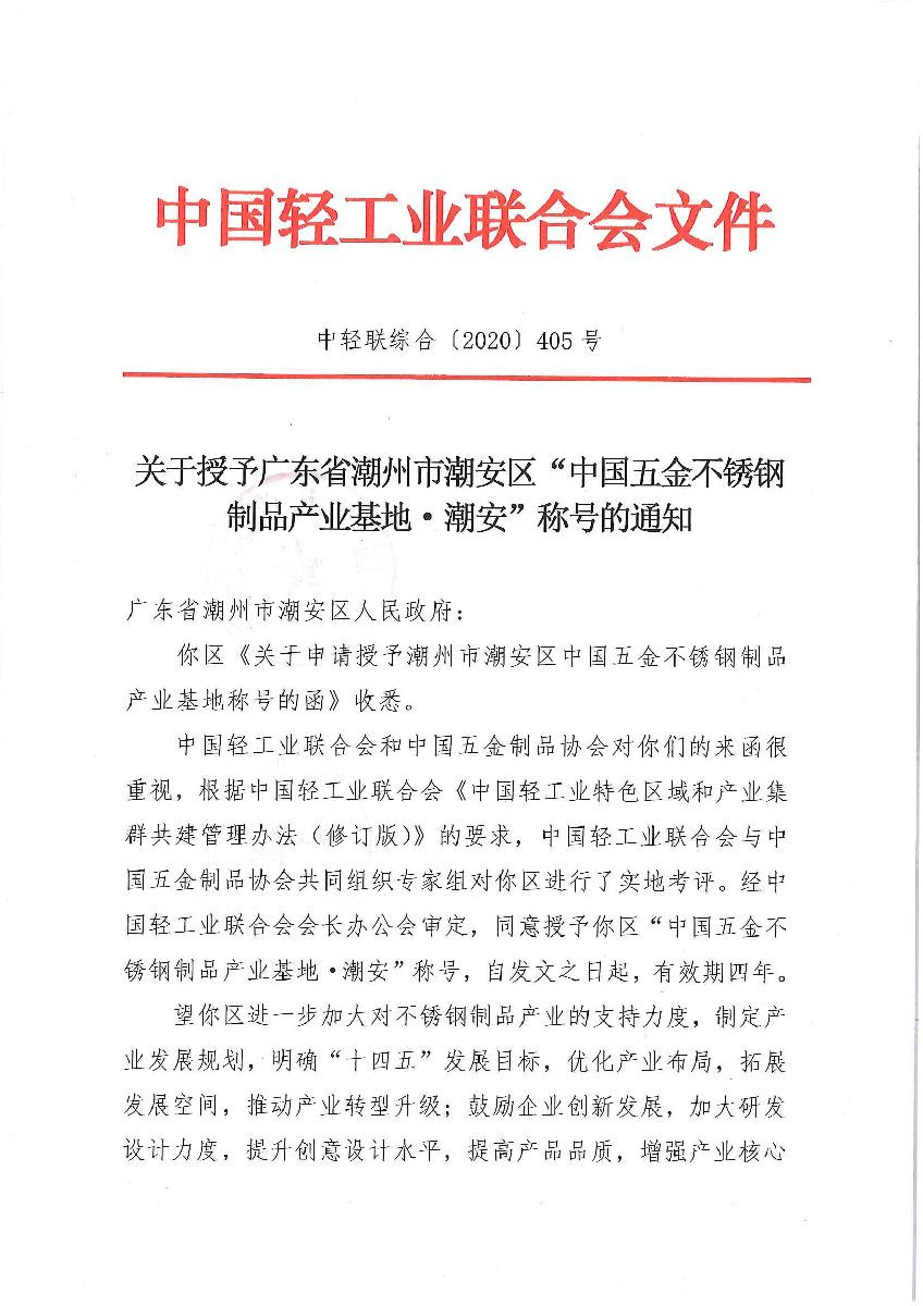 关于授予广东省潮州市潮安区“中国五金不锈钢制品产业基地·潮安”称号的通知