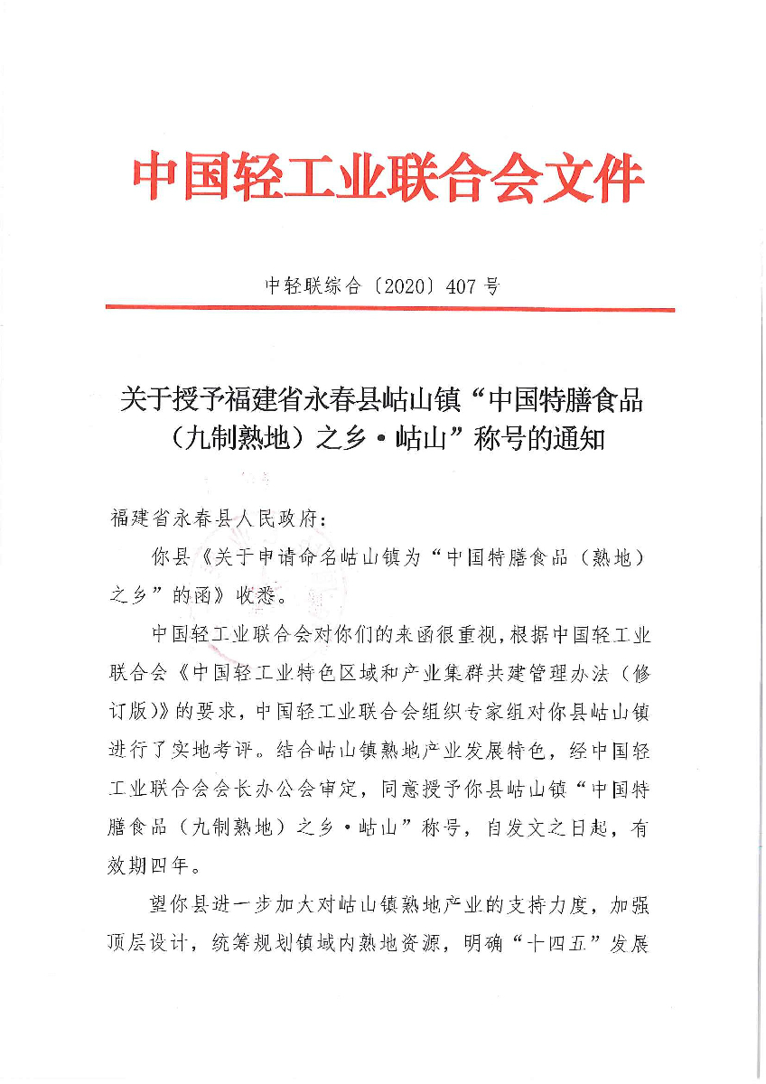 关于授予福建省永春县岵山镇“中国特色食品(九制熟地)之乡·岵山”称号的通知