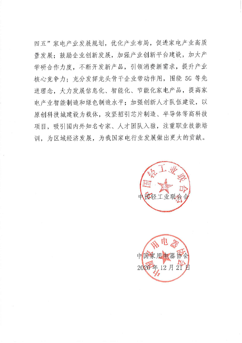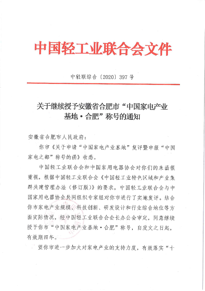 关于继续授予安徽省合肥市“中国家电产业基地·合肥”称号的通知
