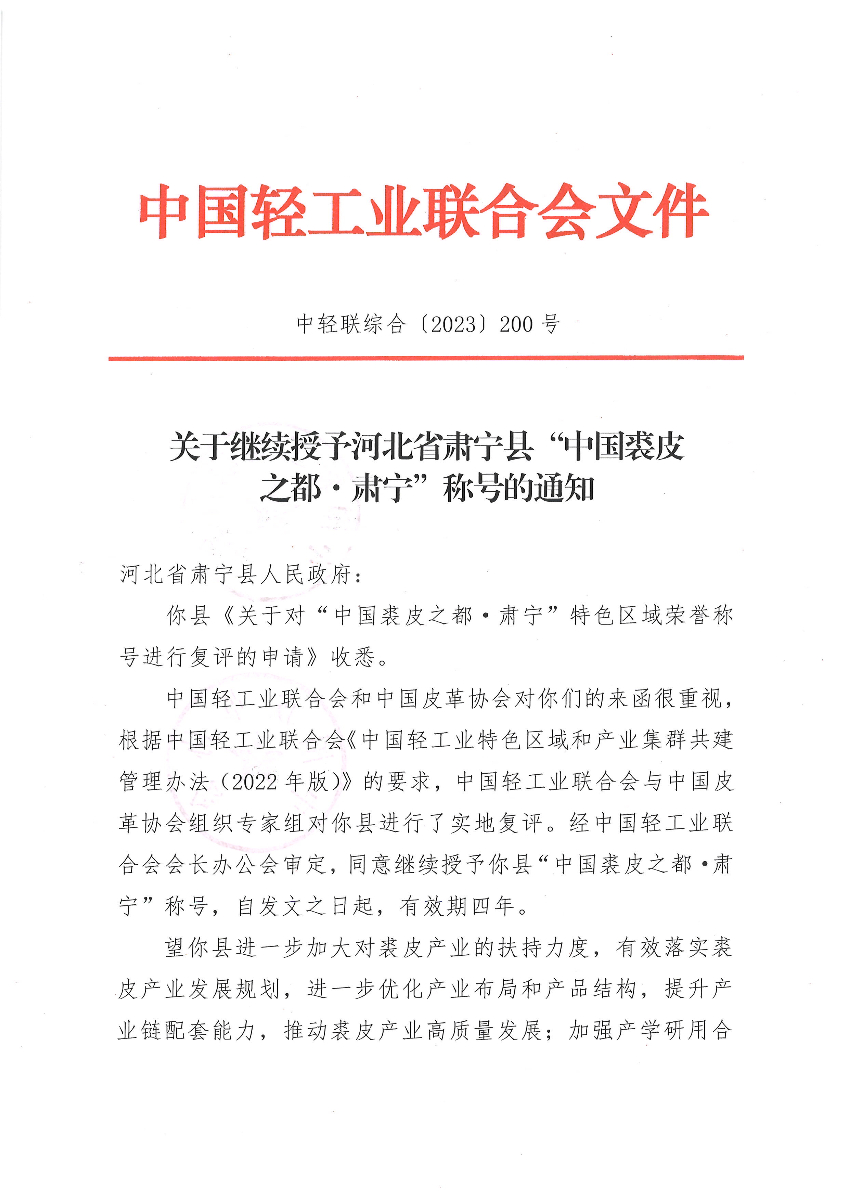糖心视频 - 关于继续授予河北省肃宁县“中国裘皮之都·肃宁”称号的通知