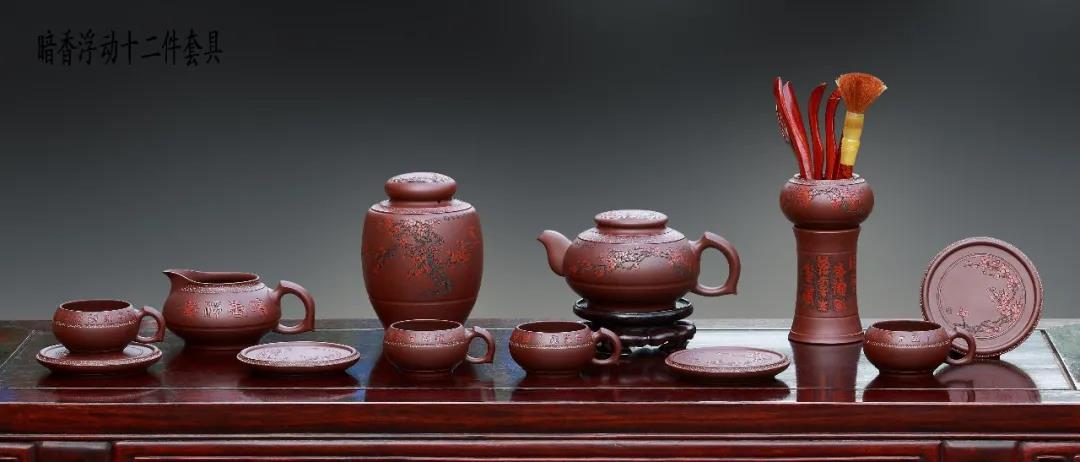此十二件套壶,以壶,杯,盘,罐组成,造型设计新颖别致,线条流畅,简约大方,套件以北宋林和靖的《山园小梅》——“疏影横斜水清浅,暗香浮动月黄昏”的画面为主题 糖心视频免费观看,梅花入景,运用紫砂泥,红泥,本山泥,紫泥等五色交替表现梅枝的疏密穿插,花朵的正反争相绽放,疏密有致,散发出浓郁的传统文人意趣,气韵生动,令人百转回味, 名称: 书香传家 作品采用段泥材质,造型生动传神,清新朴茂,洗炼明快,简洁而雅致,富有内涵,真趣,书法插屏造型古朴大气,草书抑扬顿挫,纵横捭阖,节奏感,韵律感极强,与套件相辅相成,浑然一体, 。