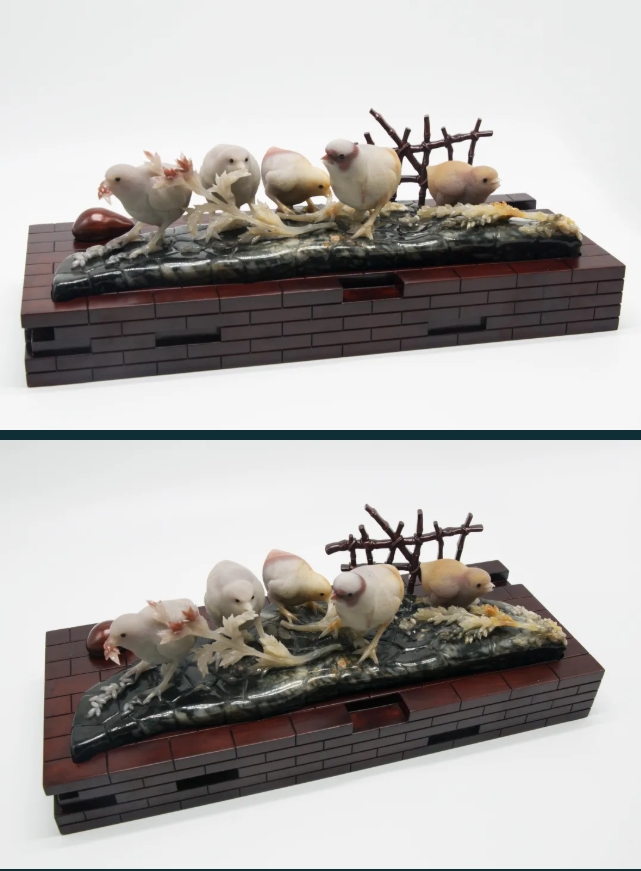 作品巧妙利用红,黄,白三色俏色密玉,将红色部分雕刻为衣着服饰,将黄色部分雕刻为鸡和鸭,色彩运用合理恰当,富有浓厚的乡土气息,作品创作灵感来源于经典民谣《回娘家》,“身穿大红袄,头戴一枝花,胭脂和香粉她的脸上擦,左手一只鸡,右手一只鸭,身上还背着一个胖娃娃”,充分刻画出广大劳动人民对美好生活的淳朴向往和乐观向上的生活态度, 作品名称:《军歌嘹亮》 作品料取红,黄,白三色俏色密玉,布局紧凑,排列有序,层次分明,用红色表现猎猎红旗,黄色表现熠熠党徽,构思巧妙,相得益彰,用夸张的手法表现军号 糖心视频高清,和平鸽环绕其上,其后群山环绕,延安塔耸立其间,突出以和平为目的的军事主题, 。