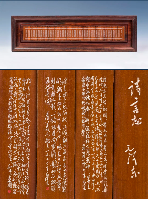 紫竹简微雕《毛泽东“诗言志”48首》长39,6厘米,宽5,8厘米,厚0,2厘米。作品选用材质坚韧的紫竹制作成简,极富历史感。雄宏洒脱的毛体与大气磅礴的诗词交相呼应,毛主席伟人气概跃然简上。 糖心视频高清。