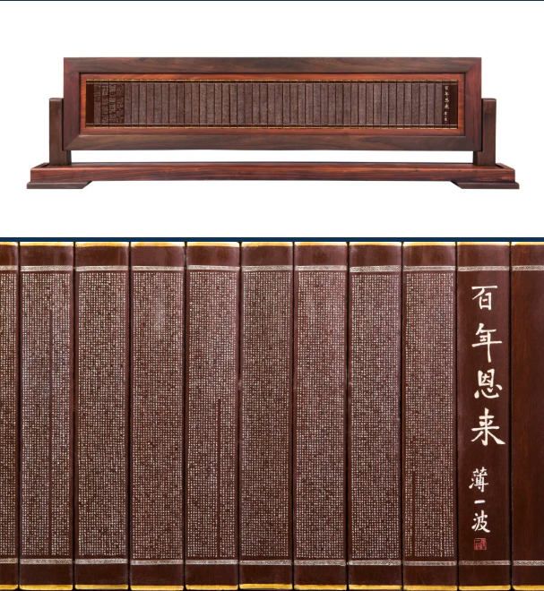 红木木简微雕《百年恩来》长64,69厘米,宽8厘米,厚0,2厘米。片简之上容纳了20万字,记录了周总理的卓著贡献和不朽人生。白色微字与深色木简形成了鲜明的对比,给人以强烈的视觉冲击。 糖心视频免费观看。