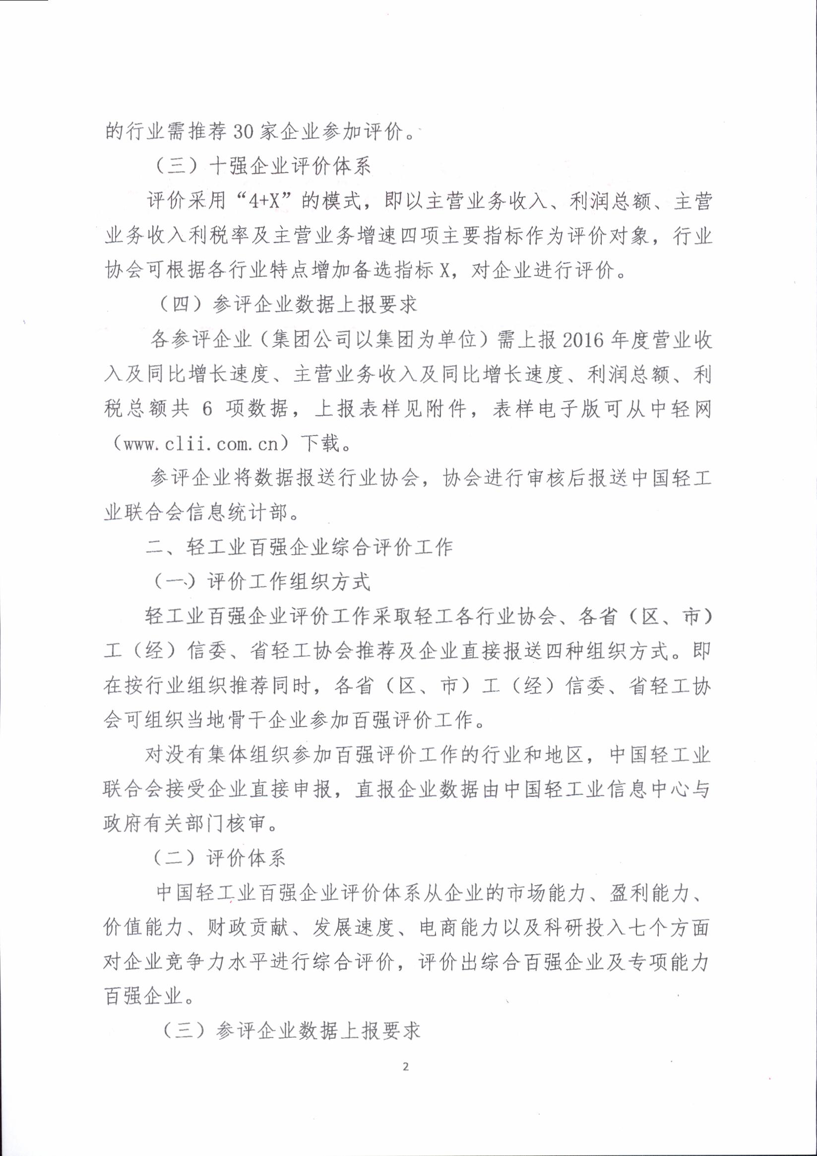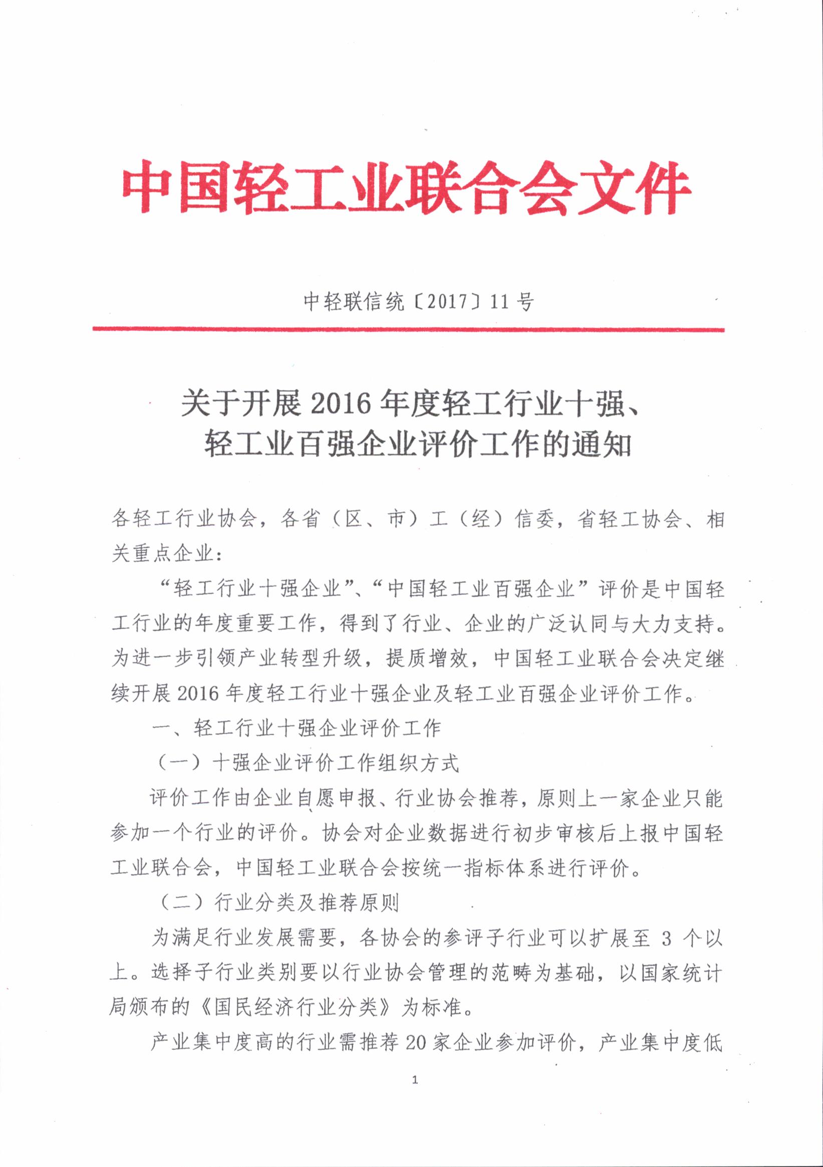 关于开展2016年度轻工行业十强、轻工业百强企业评价工作的通知