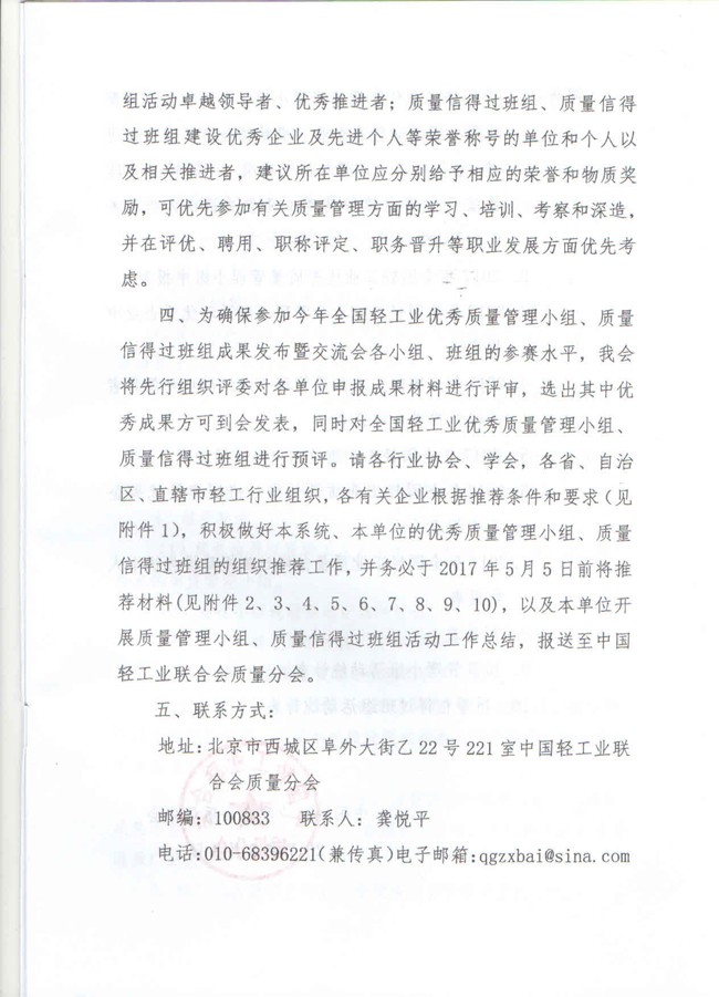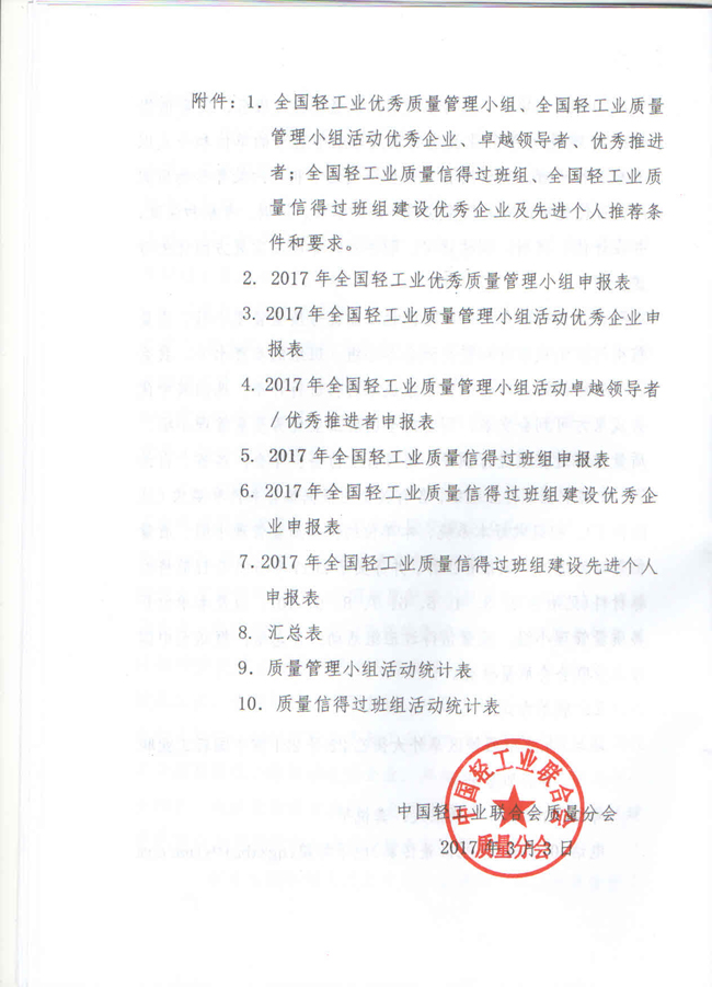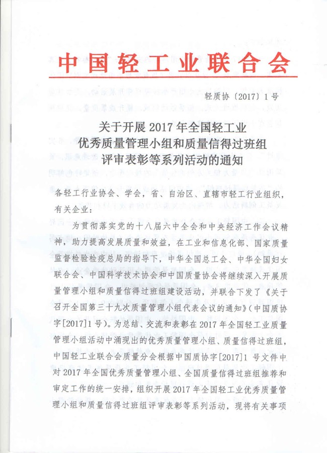 关于开展2017年全国轻工业优秀质量管理小组和质量信得过班组评审表彰等系列活动的通知