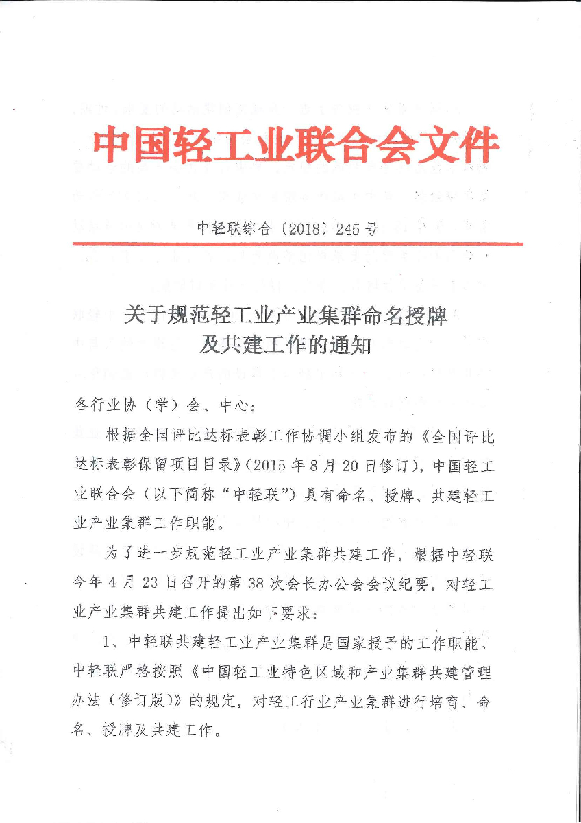 关于规范轻工业产业集群命名授牌及共建工作的通知