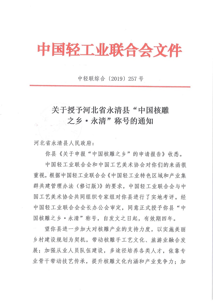 关于授予河北省永清县"中国核雕之乡·永清"称号的通知