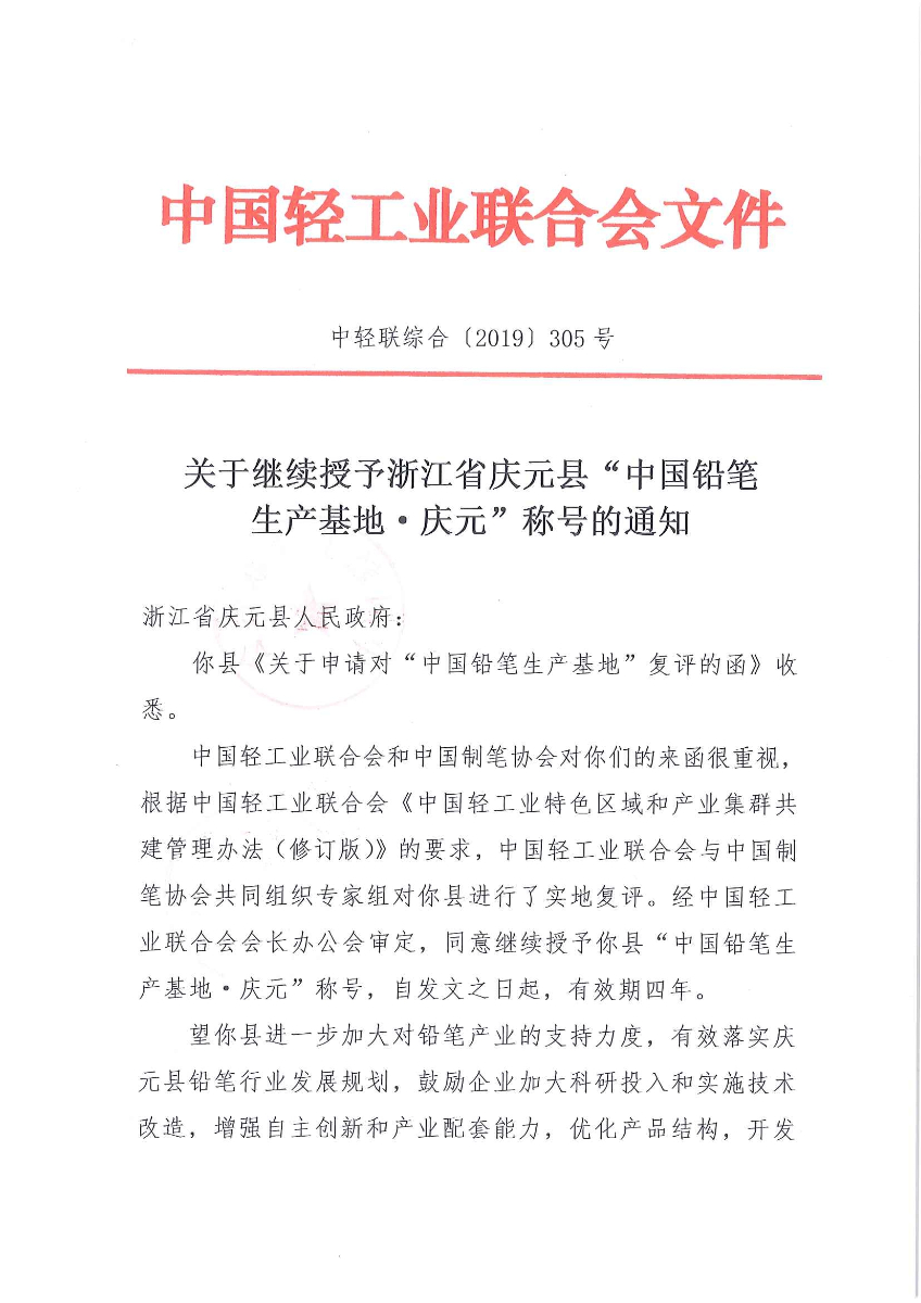 关于继续授予浙江省庆元县“中国铅笔生产基地·庆元”称号的通知