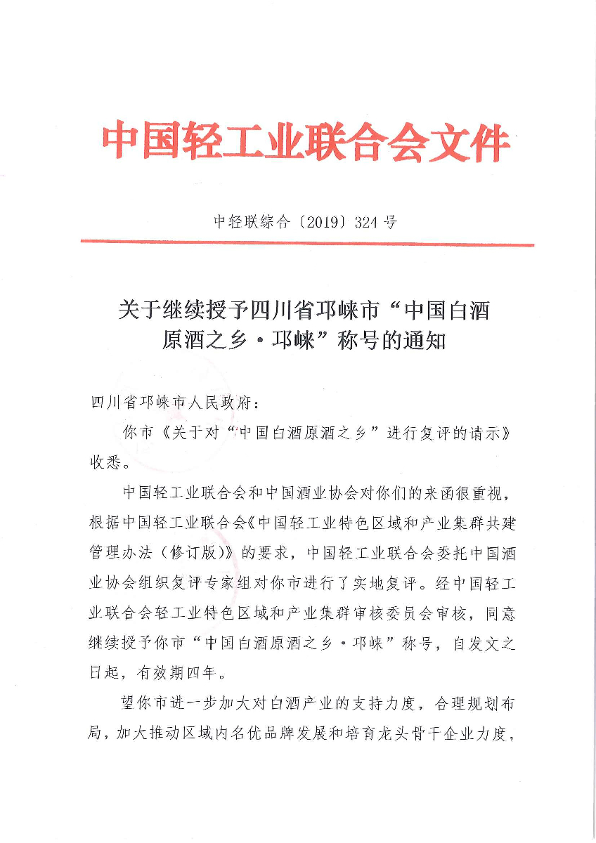 关于继续授予四川省邛崃市“中国白酒原酒之乡·邛崃”称号的通知