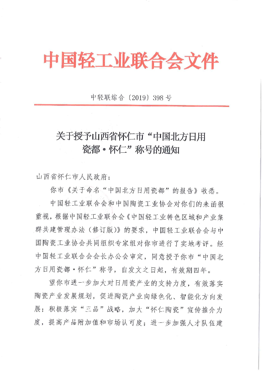 关于授予山西省怀仁市“中国北方日用瓷都·怀仁”称号的通知