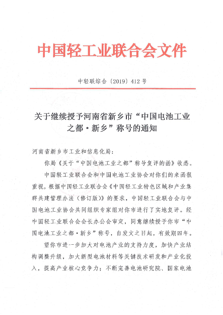 关于继续授予河南省新乡市“中国电池工业之都·新乡”称号的通知