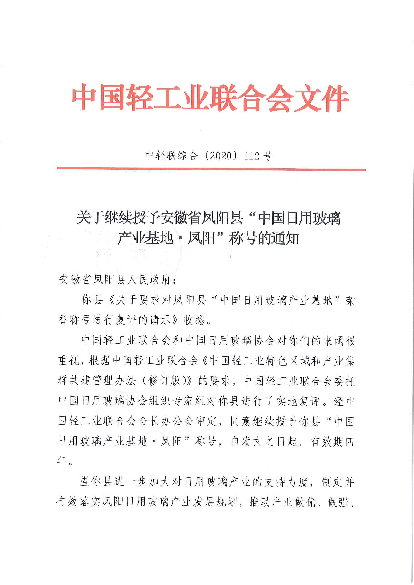 关于继续授予安徽省凤阳县“中国日用玻璃产业基地·凤阳”称号的通知