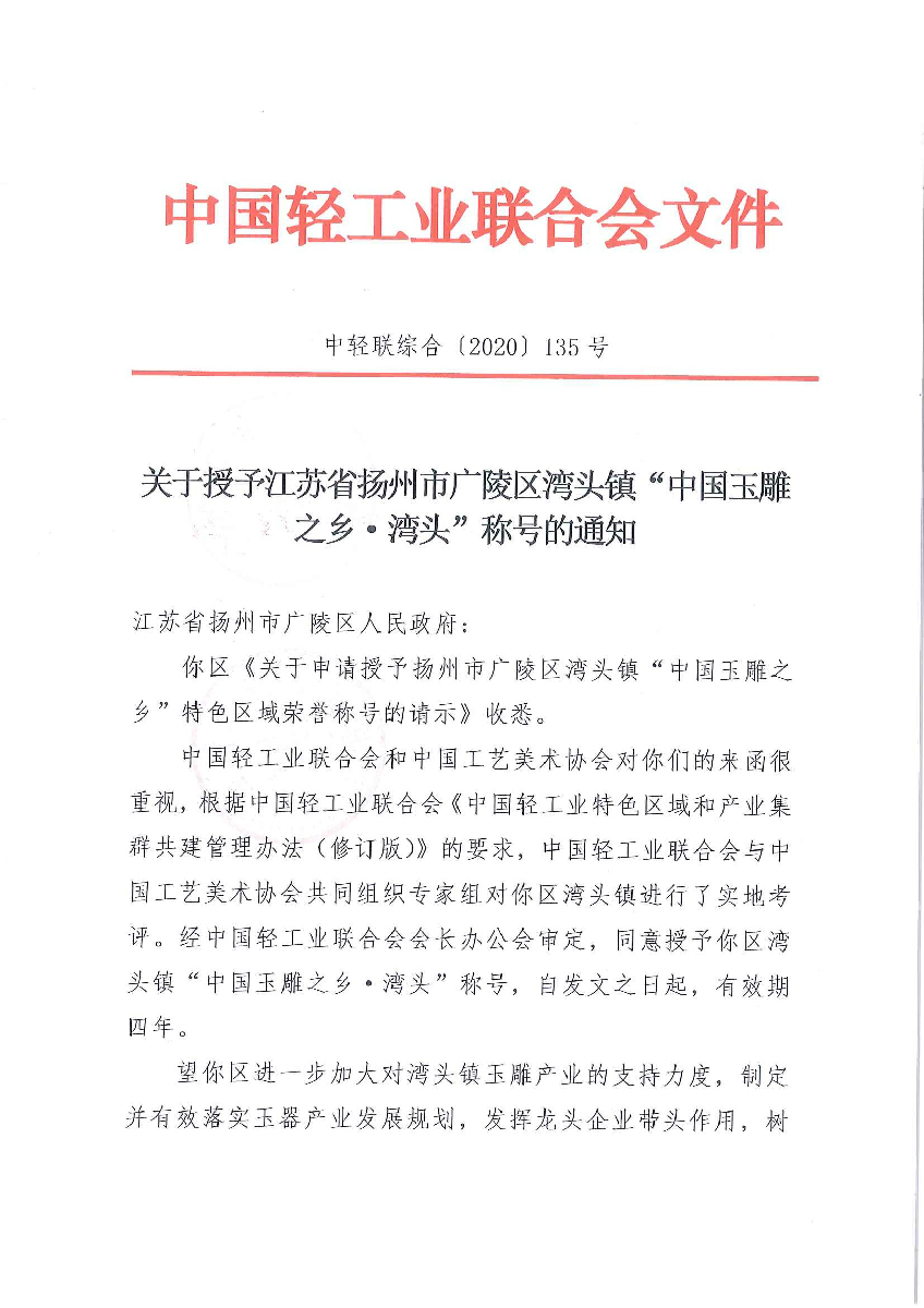关于授予江苏省扬州市广陵区湾头镇“中国玉雕之乡·湾头”称号的通知