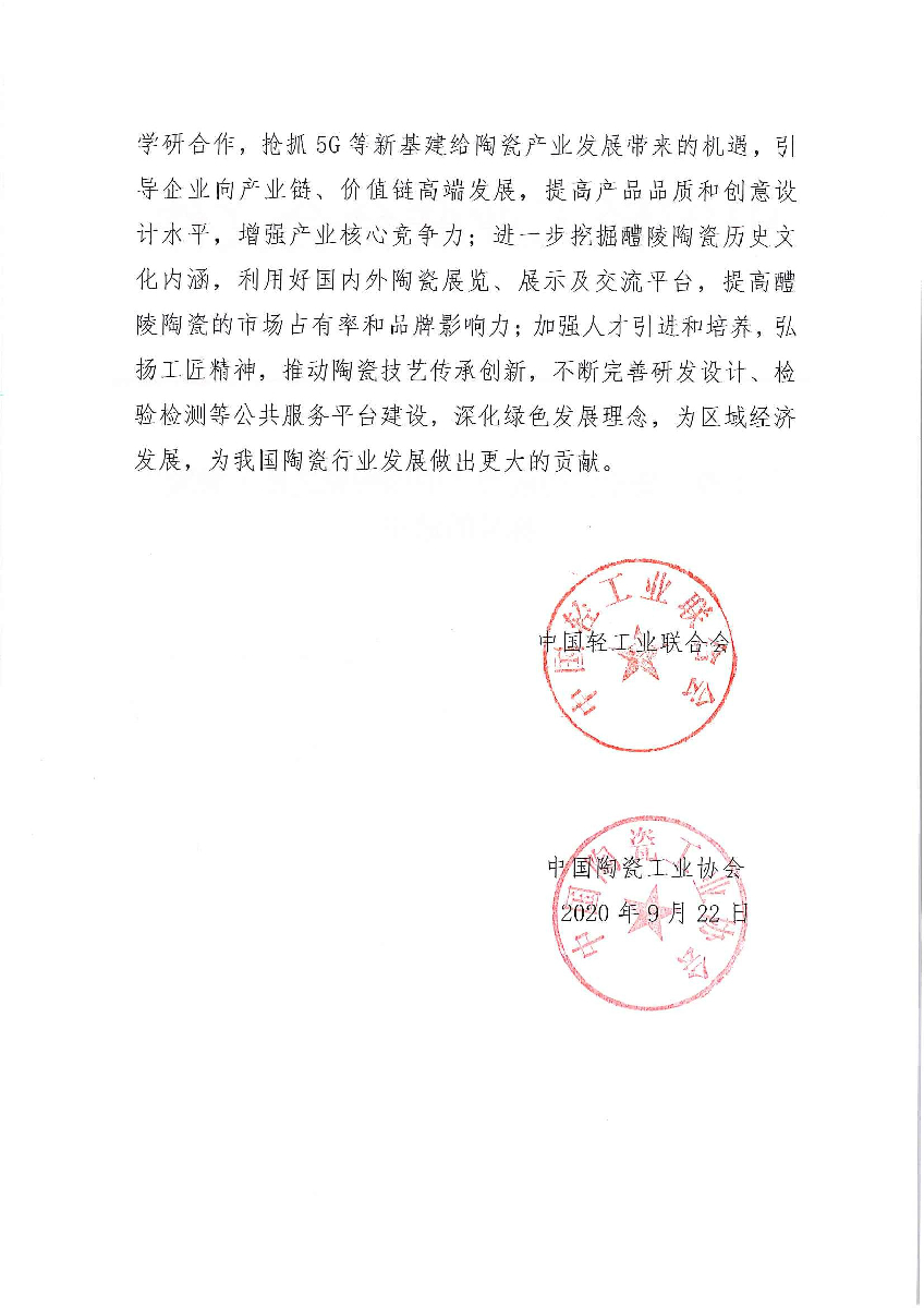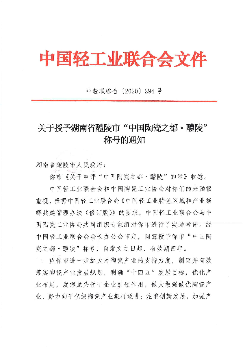 关于授予湖南省醴陵市“中国陶瓷之都·醴陵”称号的通知