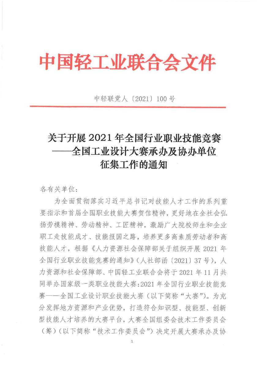 关于开展2021年全国行业职业技能竞赛——全国工业设计大赛承办及协办单位征集工作的通知 (糖心视频)