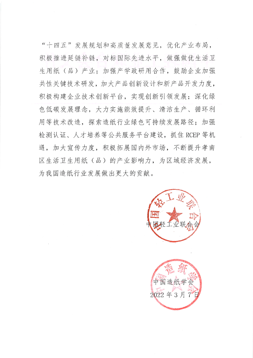 关于授予湖北省孝感市孝南区“中国生活卫生用纸(品)产业之都·孝南”称号的通知
