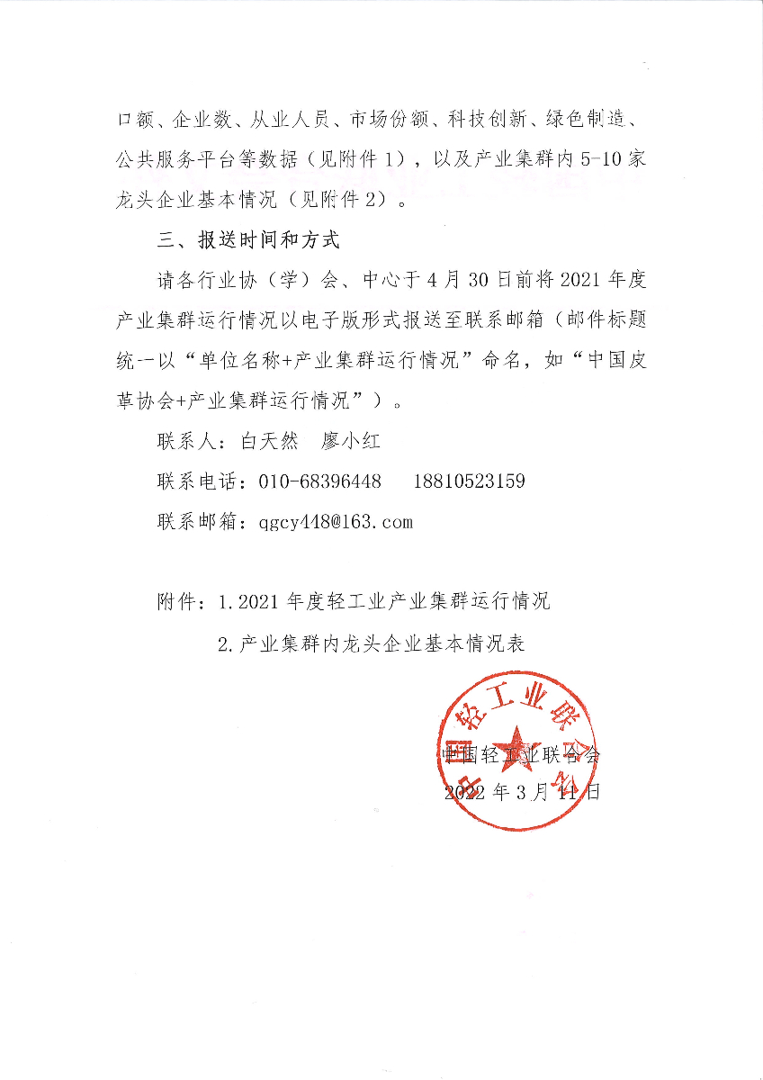 关于报送2021年度轻工业产业集群运行情况的通知