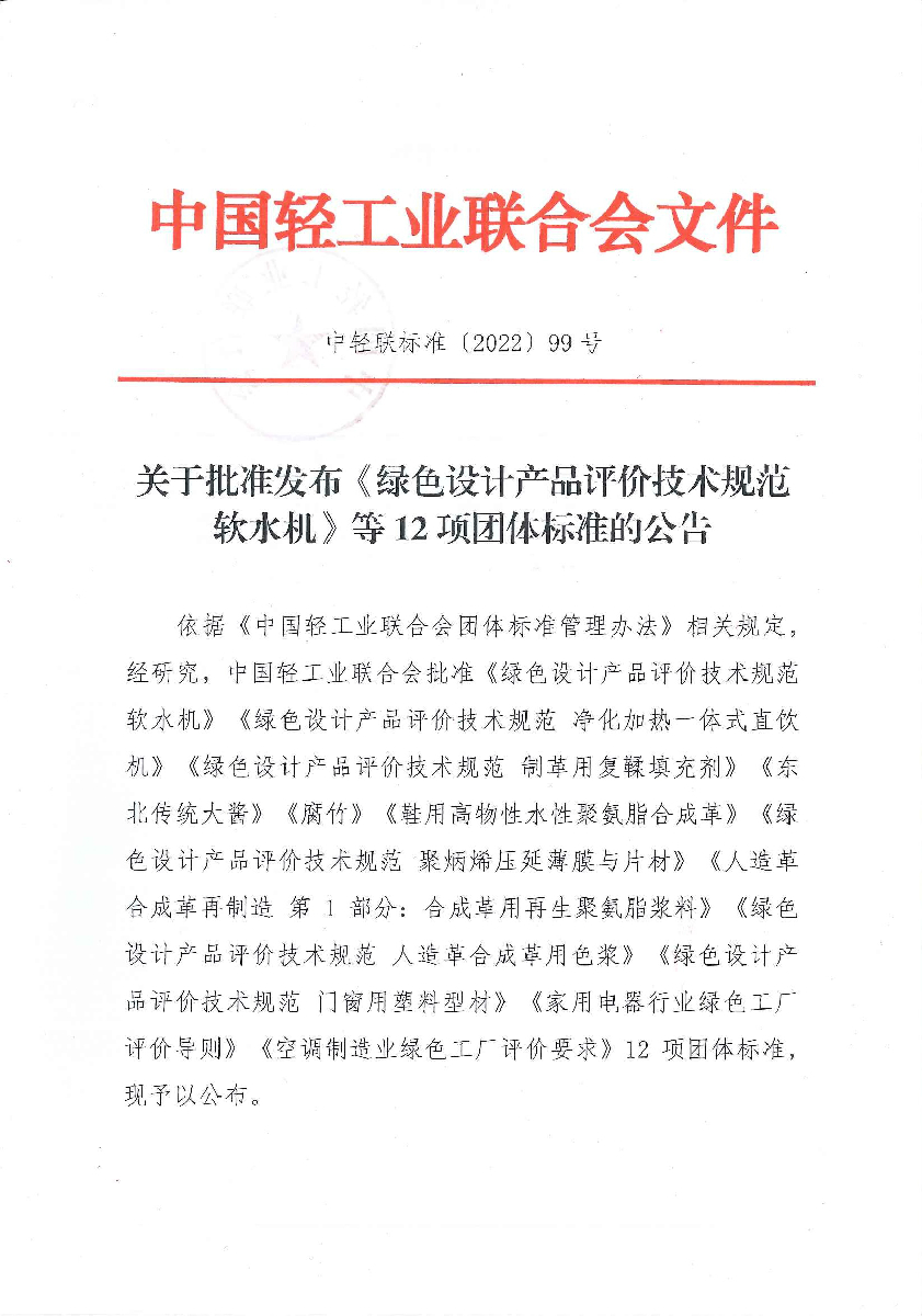 关于批准发布《绿色设计产品评价技术规范 软水机》等12项团体标准的公告