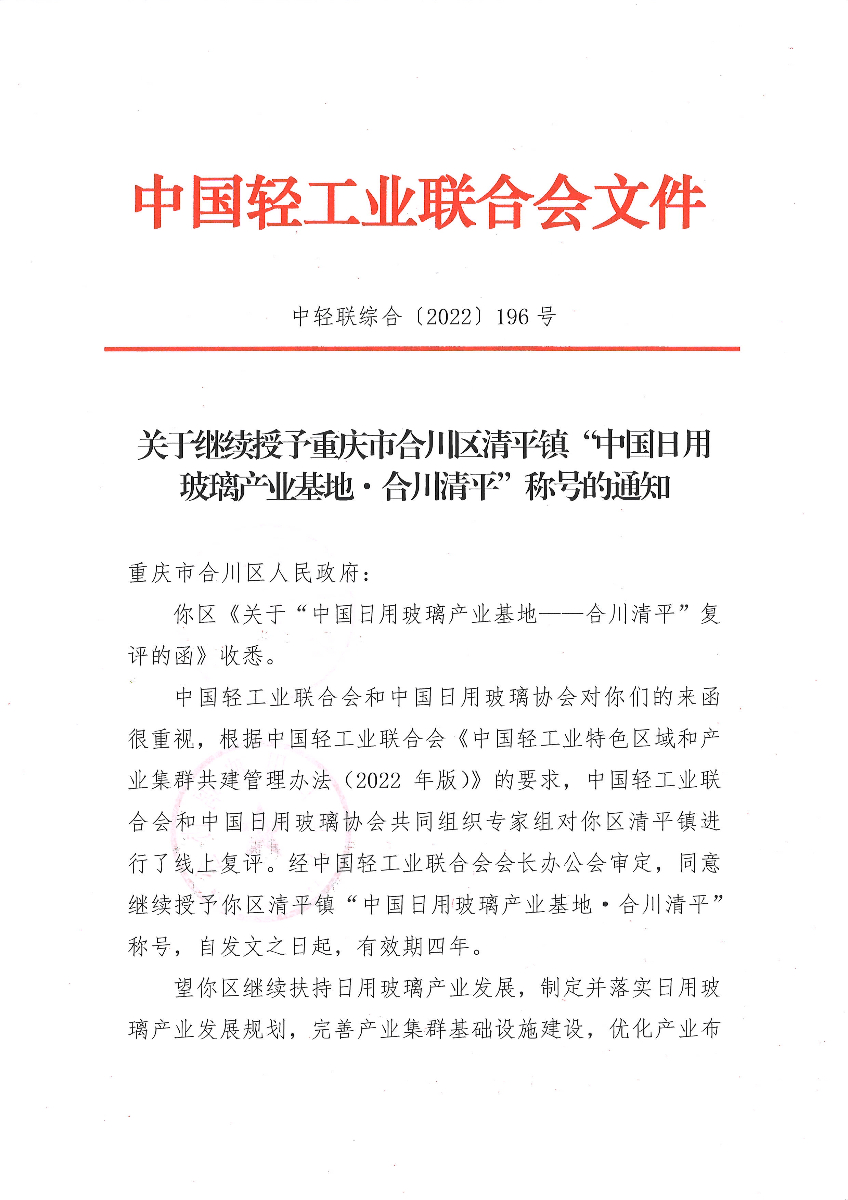 关于继续授予重庆市合川区清平镇“中国日用玻璃产业基地·合川清平”称号的通知 (糖心视频)