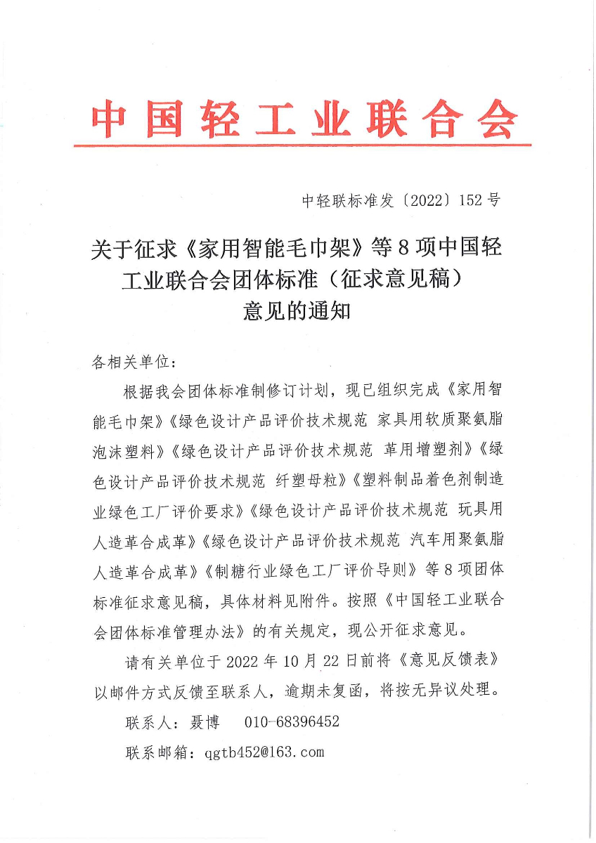 关于征求《家用智能毛巾架》等8项糖心视频业联合会团体标准(征求意见稿)意见的通知