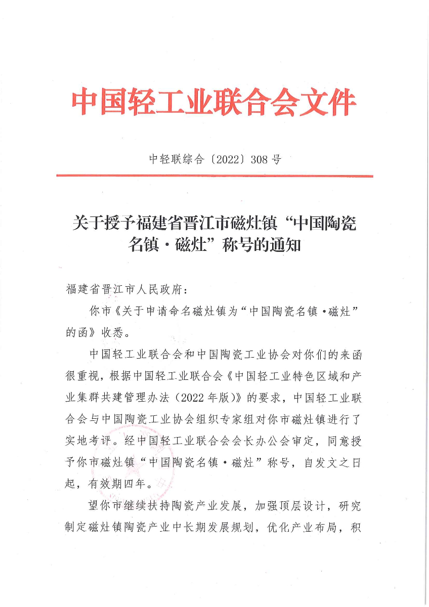 关于授予福建省晋江市磁灶镇“中国陶瓷名镇·磁灶”称号的通知