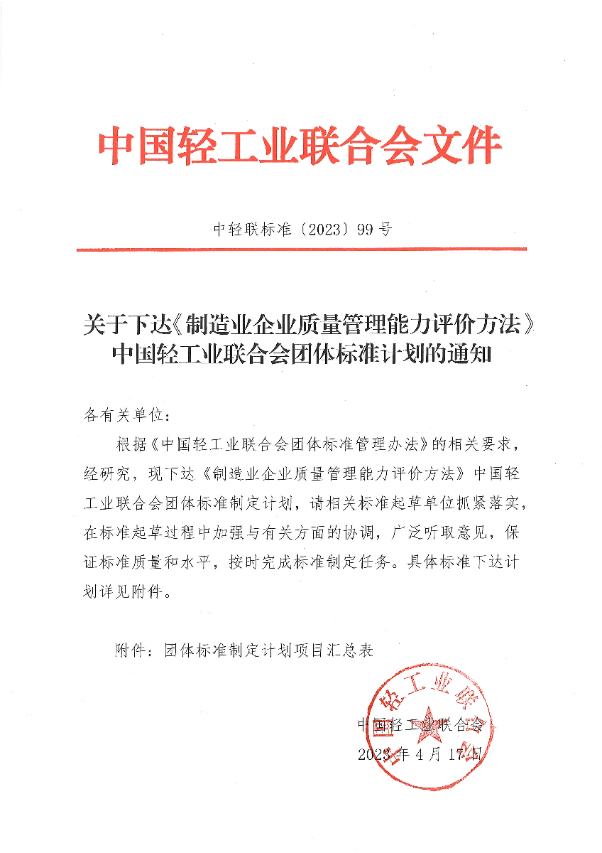 关于下达《制造业企业质量管理能力评价方法》糖心视频业联合会团体标准计划的通知