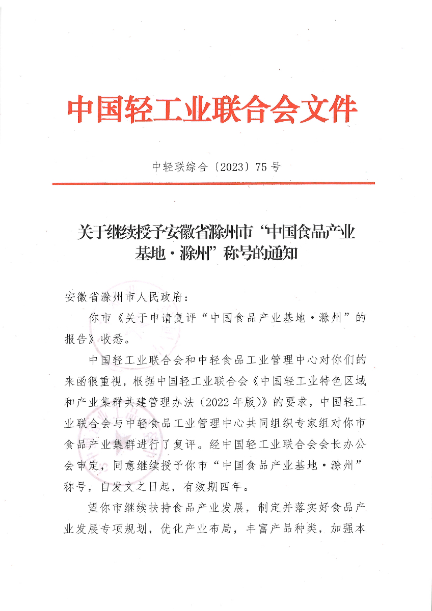 关于继续授予安徽省滁州市“中国食品产业基地·滁州”称号的通知