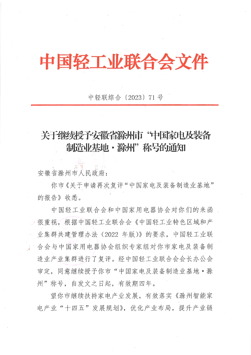 "糖心视频" 关于继续授予安徽省滁州市“中国家电及装备制造业基地·滁州”称号的通知