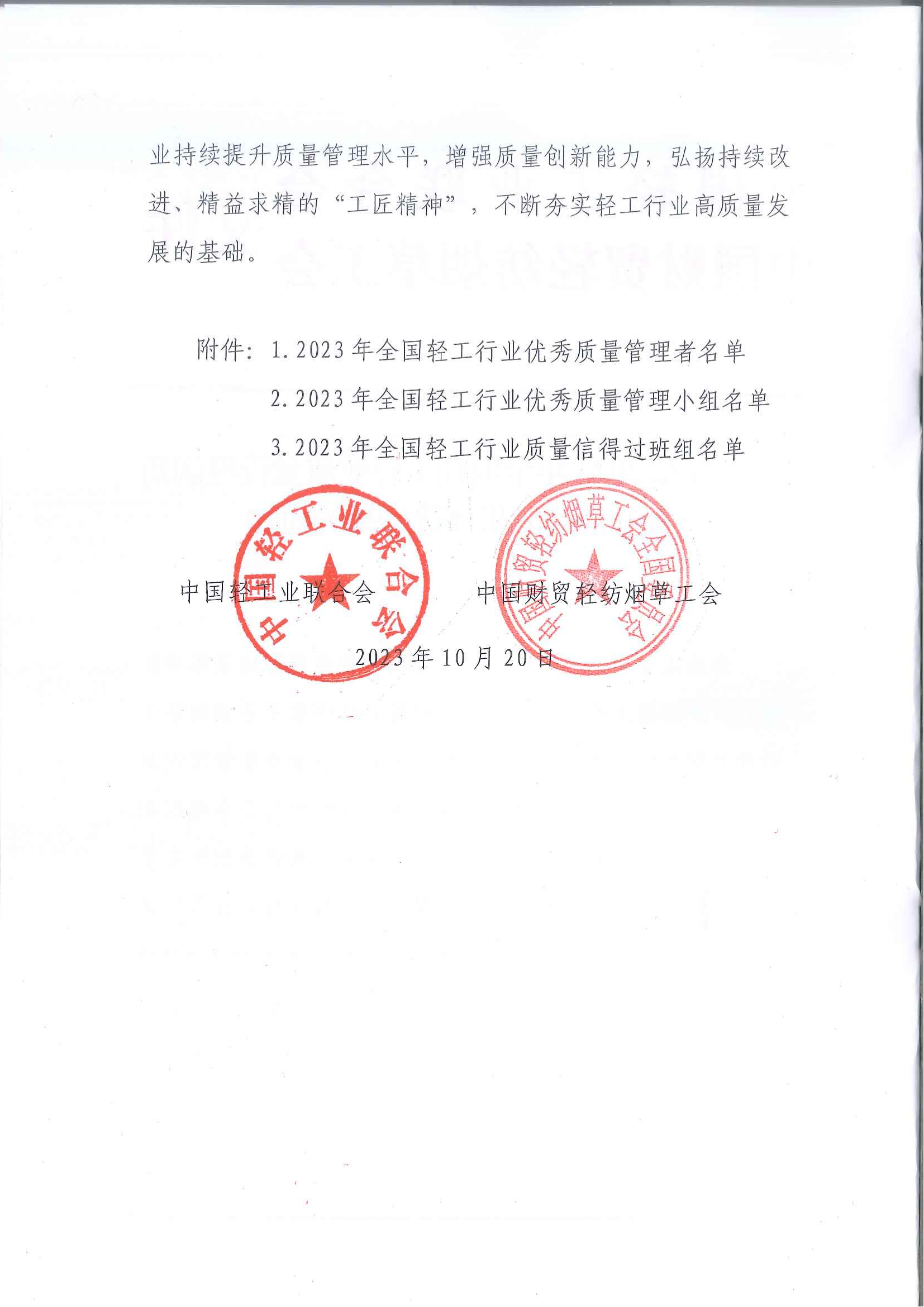 关于发布2023年全国轻工行业质量管理创新提升活动成果评选结果的通知